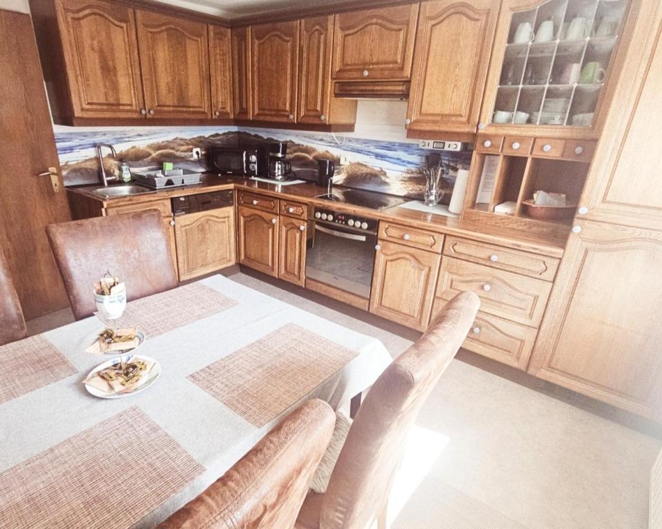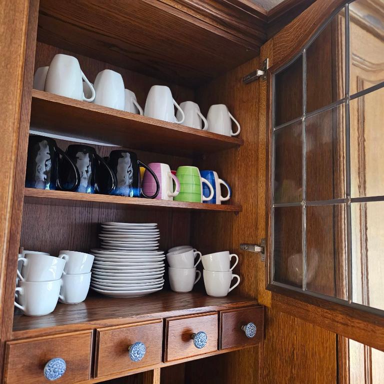 Die Küche in unserer Ferienwohnung ist mit allen wichtigen Küchengeräten ausgestattet . Hier finden Sie alles, was Sie für einen angenehmen Aufenthalt benötigen, egal ob Sie sich nur ein schnelles Frühstück zubereiten möchten oder ein ausgefallenes Abendessen.